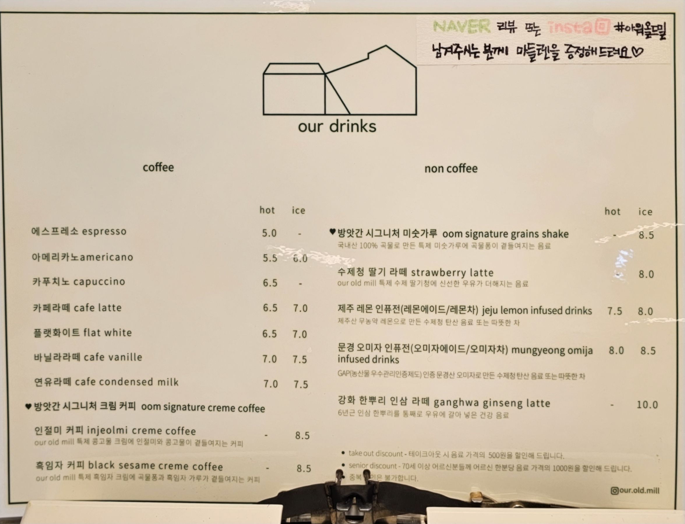 저희는 방앗간 시그니처 크림커피에서 인절미 커피, 방앗간 시그니처 미숫가루, 메뉴판에는 없지만 우리쌀 됫박 티라미수